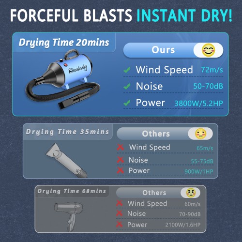 - Powerful blow drying: The wind is strong enough to pass through the hair and reach the surface of the skin.Dog hair dryer is equipped with an upgraded 3800w/5.2PS motor. It can continuously deliver strong performance. You can use the button to set the wind speed, and the speed range is 15-75m/s